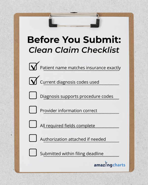 Many practices use software that checks claims before submission. Amazing Charts' clearinghouse offers internal claim scrubbing before claims are sent, catching errors before they become denials.